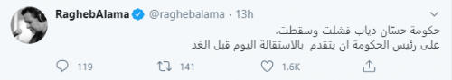 وقال راغب علامة عبر حسابه على موقع التواصل الاجتماعى تويتر فيه "حكومة حسّان دياب فشلت وسقطت.. على رئيس الحكومة أن يتقدم بالاستقالة اليوم قبل الغد".