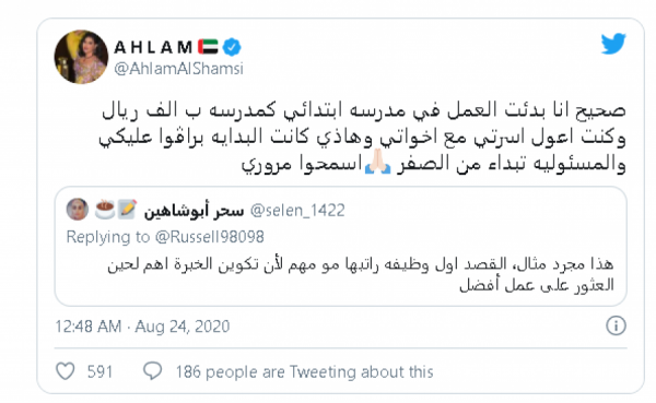 ردت الفنانة الإماراتية ​أحلام الشامسي​ على الصحافية السعودية التي اعتبرت ان راتب أول وظيفة ليس مهم لان تكوين الخبرة هو الاهم حتى الحصول على عمل أفضل وكشفت عن امور عن ماضيها وبداياتها في العمل قبل أن تحترف الغناء.