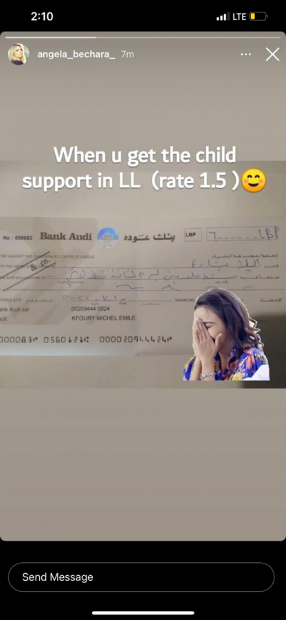 وظهر عبر خاصية القصص المصوّرة الشيك الذي تلقّته من وائل أخيراً بتاريخ 1-7-2021 بقيمة ستة ملايين ليرة لبنانية كنفقة شهرية لابنتيهما التي تبلغ 4000 دولار، مبدية استغرابها من احتساب الدولار على سعر 1500 ليرة، في حين لامس سعر الصرف في السوق السوداء حاجز الـ18000 ليرة لبنانية.