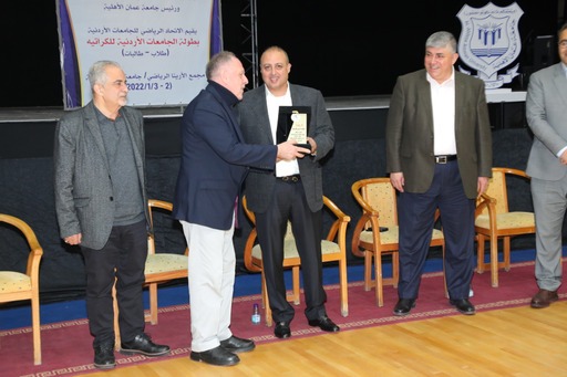 تحت رعاية الدكتور ماهر الحوراني رئيس هيئة المديرين في جامعة عمان الأهلية وبحضور الأستاذ الدكتور ساري حمدان رئيس الجامعة ورئيس الاتحاد الرياضي للجامعات الأردنية والسيد مازن القطب رئيس الاتحاد الأردني للكراتيه، اختتمت مساء يوم الاثنين الموافق 3-1-2022 منافسات بطولة الجامعات الأردنية للكراتيه للطلاب والطالبات، والتي نظمها الاتحاد الرياضي للجامعات الأردنية بالتعاون مع الاتحاد الأردني للكراتيه في مجمع الأرينا الرياضي/ جامعة عمان الأهلية خلال الفترة 2- 3 / 1 / 2022 .