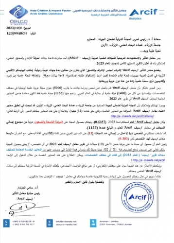 أدرج معامل التأثير والاستشهادات المرجعية للمجلات العلمية العربية "أرسيف" المجلة الدولية لضمان الجودة، والتي تصدرها عمادة البحث العلمي في جامعة الزرقاء، ضمن أفضل 100 مجلة عربية للعام 2023.