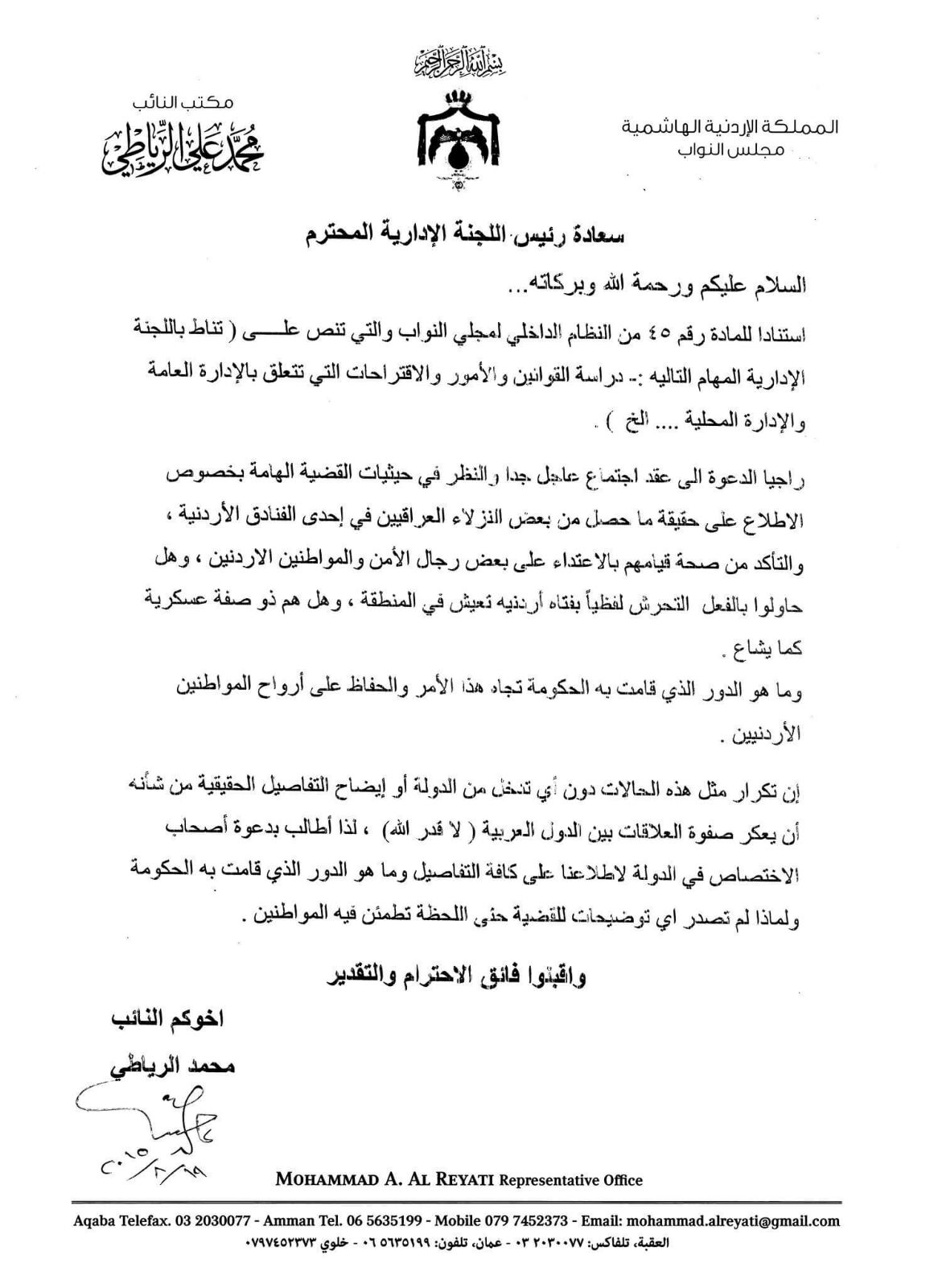 راجيا الدعوة الى عقد اجتماع عاجل جدا والنظر في حيثيات القضية الهامة بخصوص الاطلاع على حقيقة ما حصل من بعض النزلاء العراقيين في إحدى الفنادق الأردنية ، والتأكد من صحة قيامهم بالاعتداء على بعض رجال الأمن والمواطنين الاردنين ، وهل حاولوا بالفعل التحرش لفظياً بفتاه أردنيه تعيش في المنطقة ، وهل هم ذو صفة عسكرية كما يشاع .