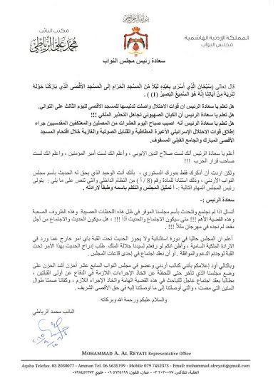 وابدى النائب الرياطي استغرابه من صمت رئيس المجلس بصفته الوحيد التي يتحدث باسم المجلس والذي يدعوا للاجتماعات ، قائلا اذا لم نجتمع من اجل الاقصى متى نجتمع اذاً!!! .متسائلا ايضا هل اجتماع من أجل مقعد لمهرجان أولى من اجتماع للأقصى !!! كما دعى رئيس المجلس الى اضافة بند الاعتداءات الصهيونيه على جدول اعمال الدورة الاستثنائيه بعد اخذ اذن جلالة الملك عليها . وتاليا نص الرسالة :-