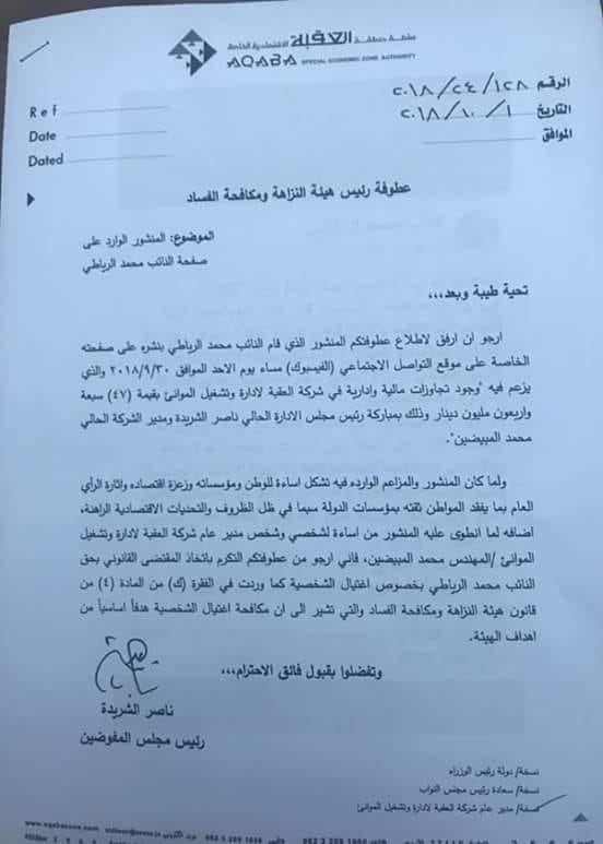 الراي نيوز- تقدم رئيس مجلس مفوضي سلطة منطقة العقبة الاقتصادية الخاصة ناصر الشريدة بشكوى الى رئيس هيئة النزاهة ومكافحة الفساد بحق النائب محمد الرياطي، بخصوص منشور للأخير زعم فيه "تجاوزات مالية وادارية في شركة العقبة لادارة وتشغيل الموانئ بقيمة 47 مليون دينار".