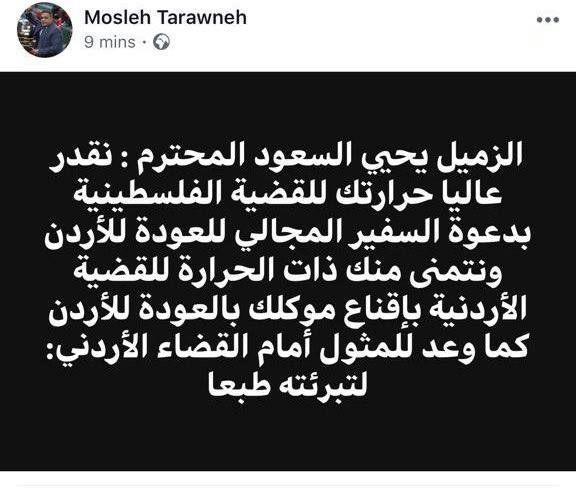وجه النائب الدكتور مصلح الطراونة رسالة لزميله النائب يحيى السعود بعد مطالبته عشيرة المجالي بالطلب من ابنهم السفير الاردني لدى دولة الاحتلال بالعودة للأردن .