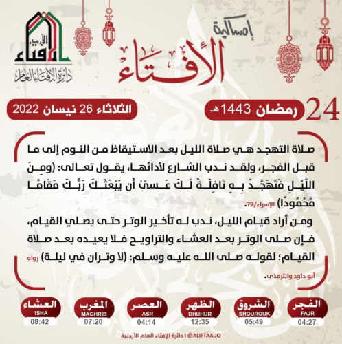 الرأي نيوز - بينت دائرة الإفتاء العام في إمساكية اليوم الرابع والعشرين من شهر رمضان المبارك فضل صلاة التهجد ووقت أدائها.