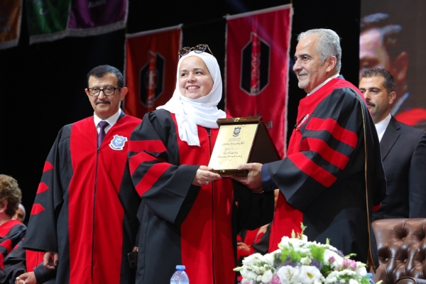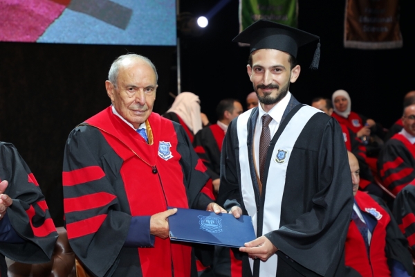 •هذا وقد تم تقديم درع تكريمي لمعالي راعي الحفل الدكتور محمد صالح الحوراني من قبل الدكتور ماهر الحوراني رئيس هيئة المديرين والاستاذ الدكتور ساري حمدان رئيس الجامعة .