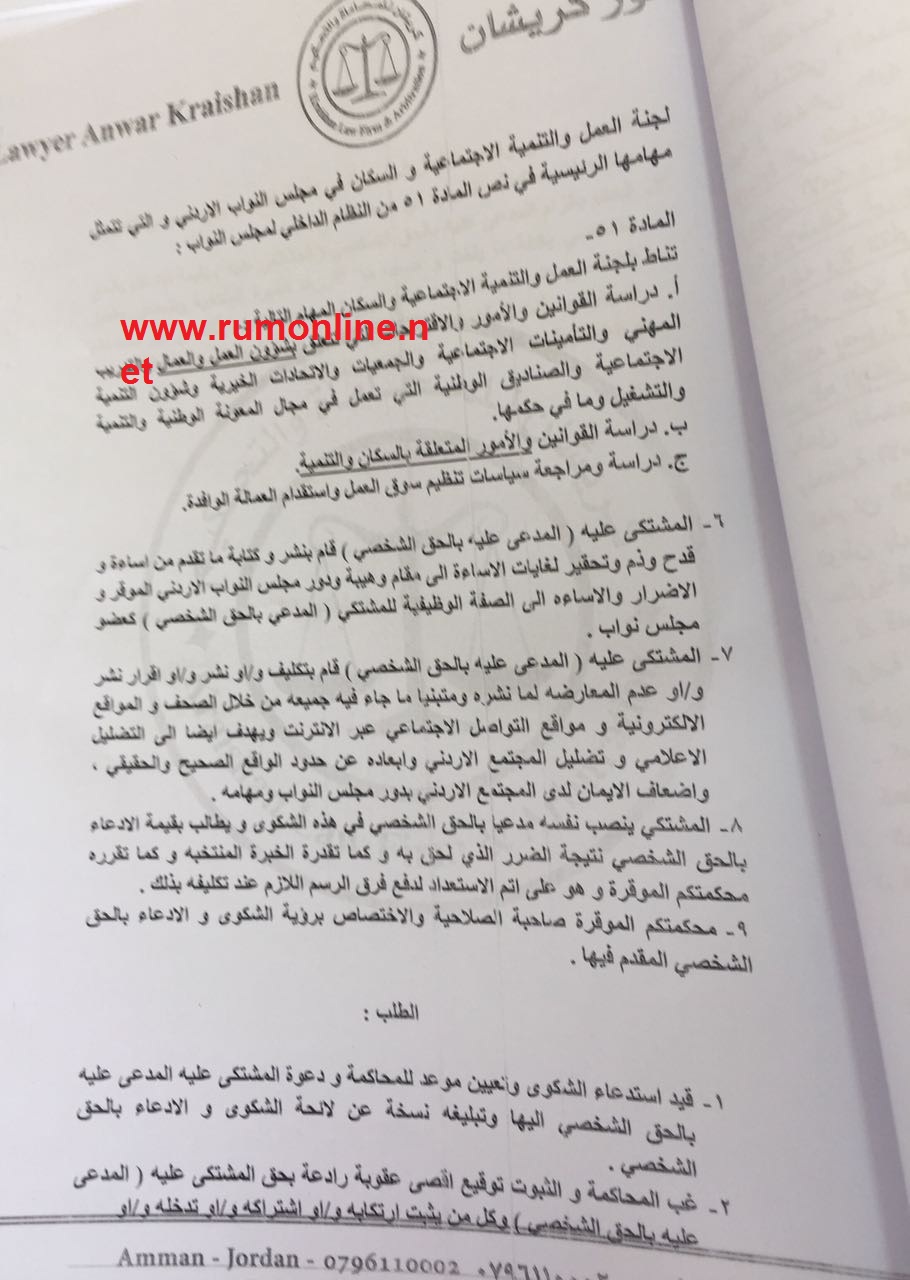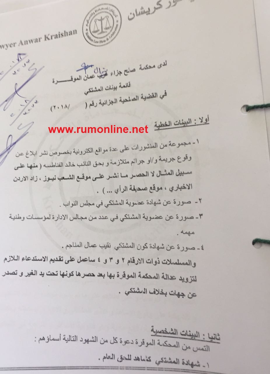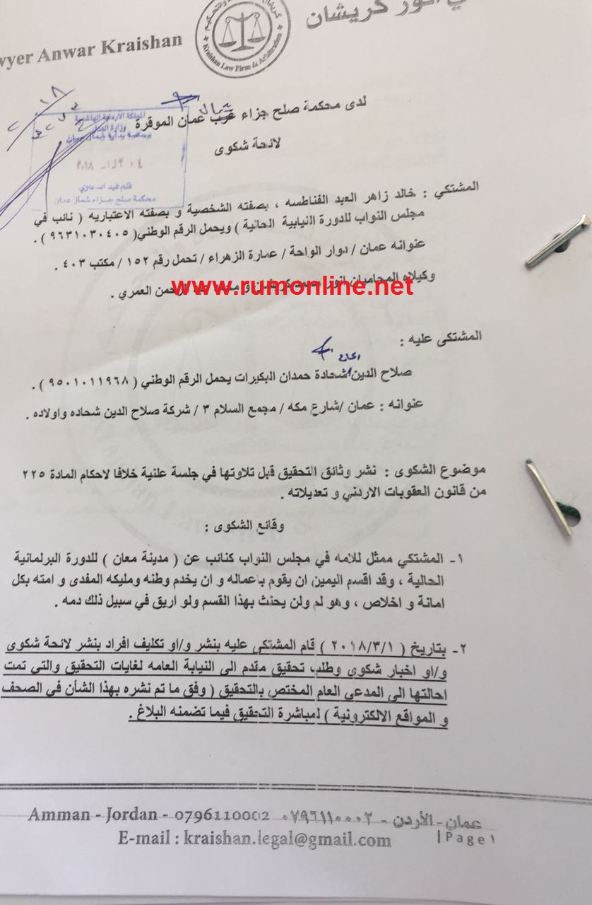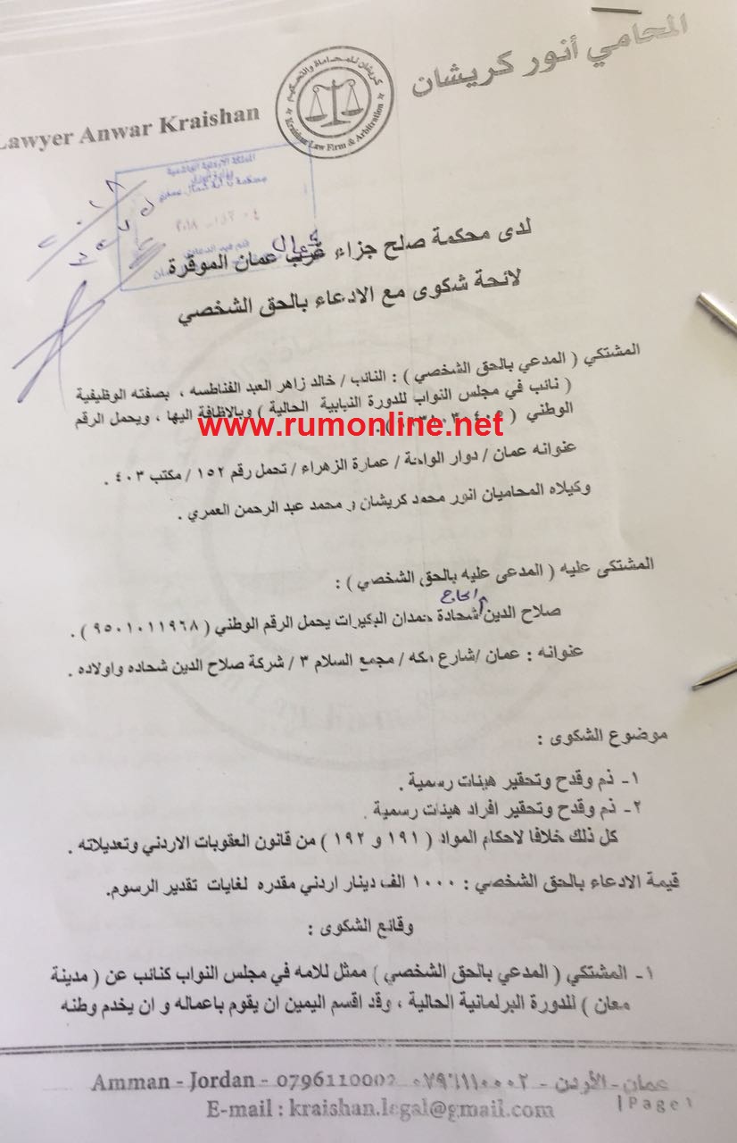 على وثائق تثبت تقديم النائب خالد الفناطسة شكوى الى المدعي العام بحق رجل الاعمال صلاح الدين شحادة بتهمة القدح والذم والتحقير الى مجلس النواب الاردني والنائب خالد الفناطسة شخصيا .