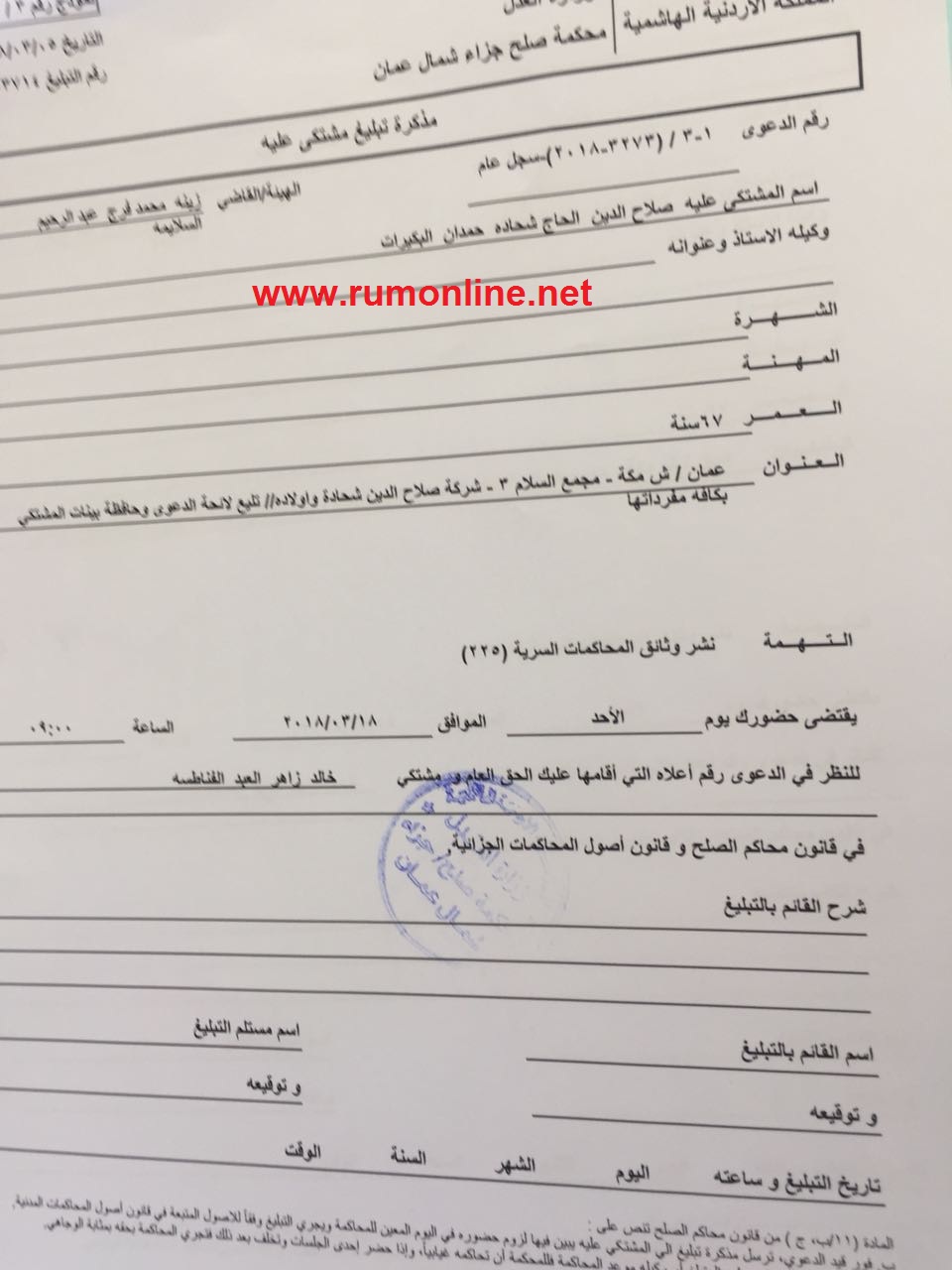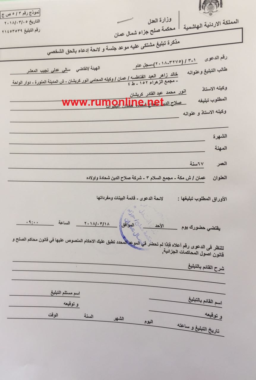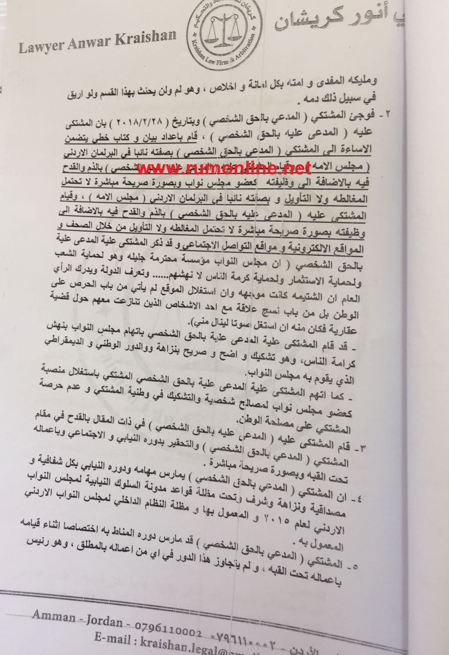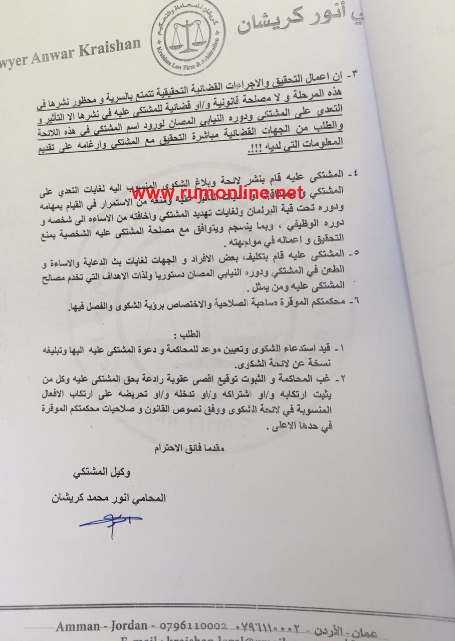 على وثائق تثبت تقديم النائب خالد الفناطسة شكوى الى المدعي العام بحق رجل الاعمال صلاح الدين شحادة بتهمة القدح والذم والتحقير الى مجلس النواب الاردني والنائب خالد الفناطسة شخصيا .