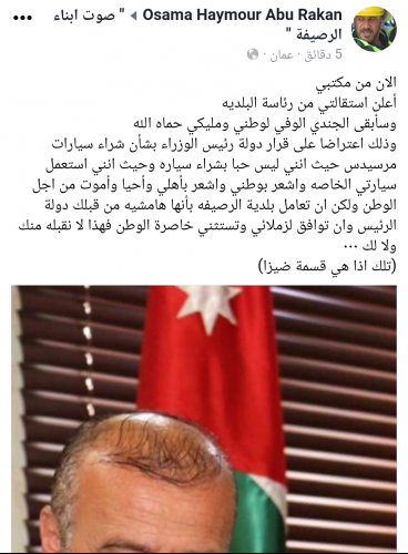 أعلن رئيس بلدية الرصيفة، أسامة حيمور، استقالته من رئاسة البلدية احتجاجا على قرار رئيس الوزراء الدكتور هاني الملقي بشراء سيارات "مرسيدس".